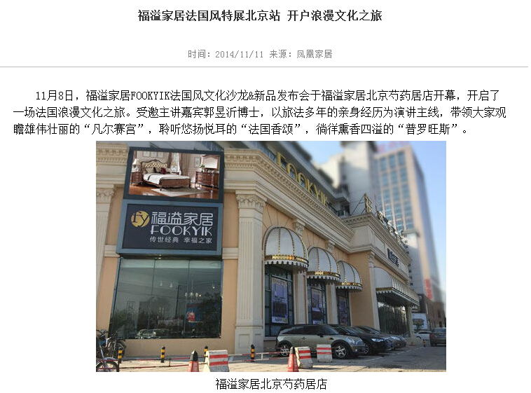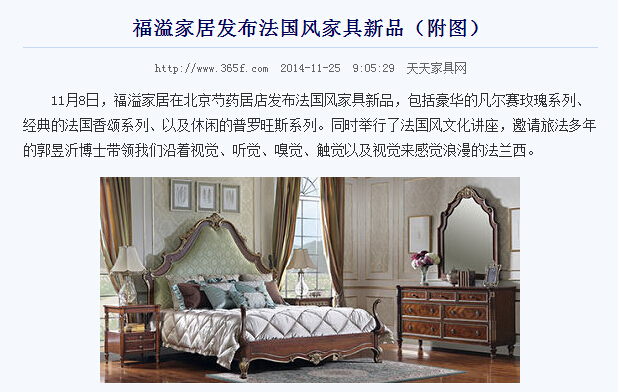 11月8日,福溢家居在北京芍藥居店發(fā)布法國風(fēng)家具新品,包括豪華的凡爾賽玫瑰系列、經(jīng)典的法國香頌系列、以及休閑的普羅旺斯系列。同時(shí)舉行了法國風(fēng)文化講座,邀請(qǐng)旅法多年的郭昱沂博士帶領(lǐng)我們沿著視覺、聽覺、嗅覺、觸覺以及視覺來感覺浪漫的法蘭西。