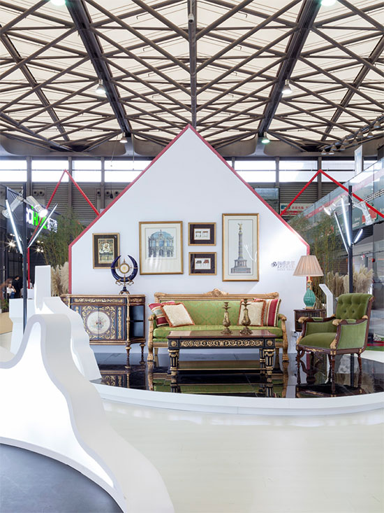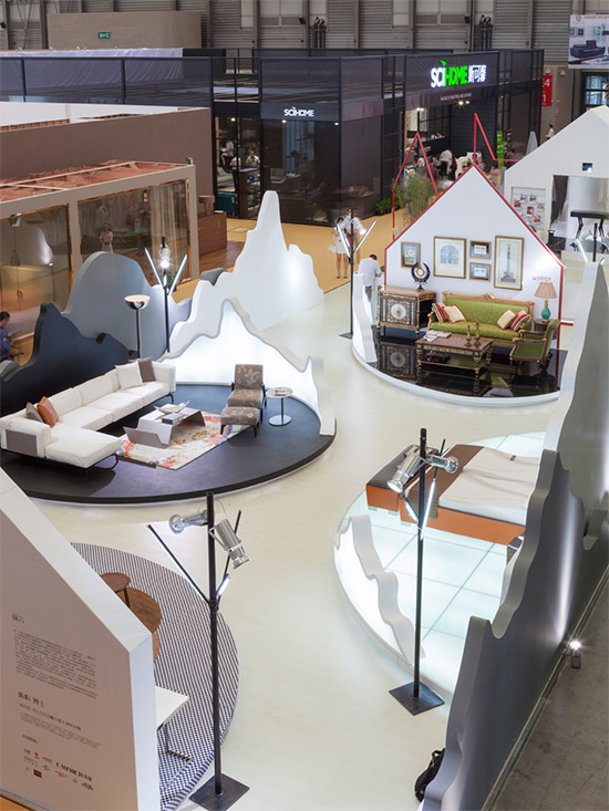 500平米的展館巧妙劃分出10個(gè)空間,展現(xiàn)了一個(gè)家庭從年輕、成熟到成功的各個(gè)階段,對(duì)家居空間的需求和生活方式的改變。漫步畫卷之中,可觀山水,雀馬魚龍。迷人的現(xiàn)代自然空間以藝術(shù)化的方式呈現(xiàn)在眾人面前,行走當(dāng)中,感悟人與自然相處的真諦。踏入展館,首先映入眼簾的是一面高達(dá)六米的山墻,特意放大的高度試圖把每位參觀者拉回兒時(shí)抬頭看物的回憶中,山墻中間只能通過一人的樓梯將人的視線引至二樓,組建家庭的神圣感莫名襲來,四周是一組如山峰般的墻體高低錯(cuò)落,客廳、臥室、餐廳、兒童房若隱若現(xiàn),空間高度逐步降低,每個(gè)空間之間最終沒有了墻體阻隔,轉(zhuǎn)而化為山水地臺(tái)區(qū)分,不同的人生階段就這樣在行走間自然呈現(xiàn)。JAB、喜臨門、福溢、銳馳、艾寶、索菲莉爾、紫璨、鴻達(dá)、法諾、迪斯凱等品牌帶來各自經(jīng)典家具產(chǎn)品與飾品,經(jīng)設(shè)計(jì)師大膽組合混搭,讓空間兼具藝術(shù)享受與生活功能,在探討人與環(huán)境、空間、物品之間的微妙對(duì)話中,折射出獨(dú)特的人文氣質(zhì)?!栋槽D》希望通過HOME PLUS生活概念館為中國本土家具品牌如何精準(zhǔn)有效地呈現(xiàn)生活方式拋磚引玉,啟發(fā)思考,讓優(yōu)秀的先鋒設(shè)計(jì)理念引領(lǐng)日常生活。