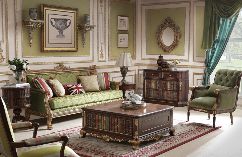 還原英國(guó)近郊溫莎城堡房間內(nèi)的珍稀古董家具,重現(xiàn)摩登18世紀(jì)的奢華皇室生活。以象征希望、和平的綠色為主基調(diào),書(shū)本彩繪飾以仿古效果為豪門(mén)大宅增添了幾許書(shū)卷情韻,描金的花朵、藤蔓雕刻,點(diǎn)綴出貴族生活的品位與真諦!